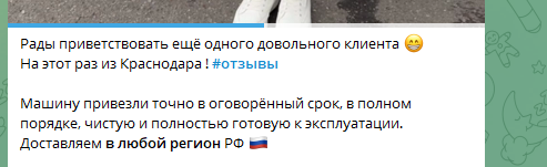 Мы не нашли независимых фидбэков клиентов, которые приобретали машины через этот паблик. В интернете о канале с таким названием ничего нет. Всё, что есть – отзывы, опубликованные самими авторами. Они включают фото и видео клиентов рядом с приобретенными авто. И эти люди хвалят сервис, например: