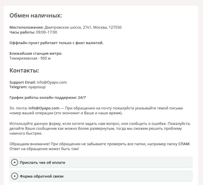 Oyapo com — онлайн-обменник, владельцы которого предлагают услуги по покупке криптовалют за рубли. Заявлено, что у компании есть физическая точка выдачи наличных в Москве.