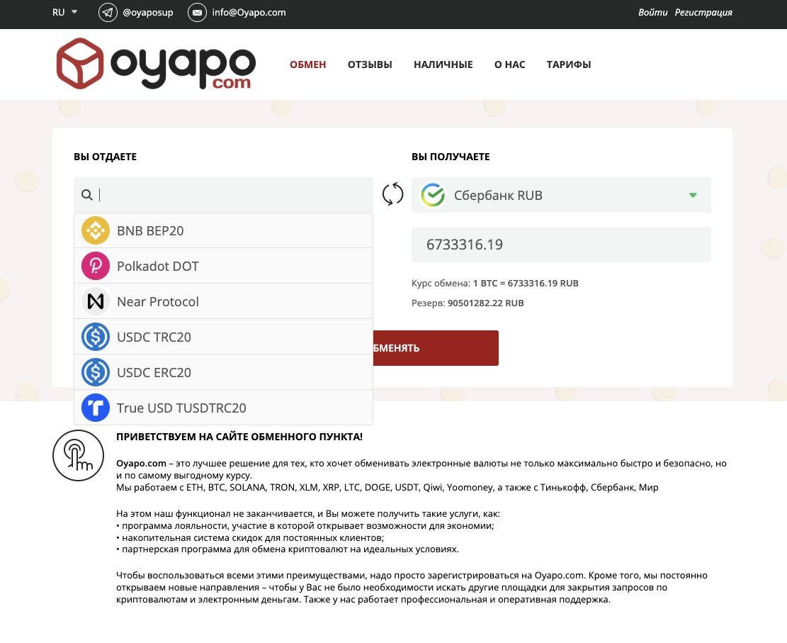 Oyapo com — эксчейнджер, через который его владельцы предлагают клиентам обменивать их цифровые активы на рубли. Сервис поддерживает работу только с российскими банковскими картами. Количество доступных криптовалют — 17.