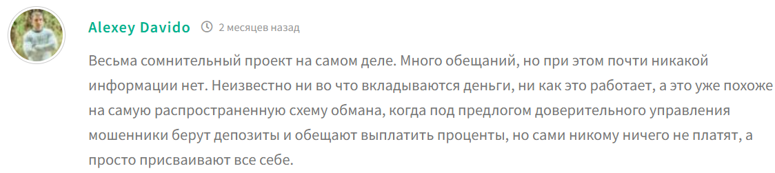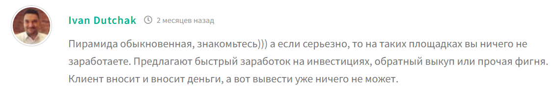 - Пользователи жалуются на то, что аферисты присваивали деньги, которые пользователи клали на депозит. Таким образом, никакую прибыль они получить не могли.