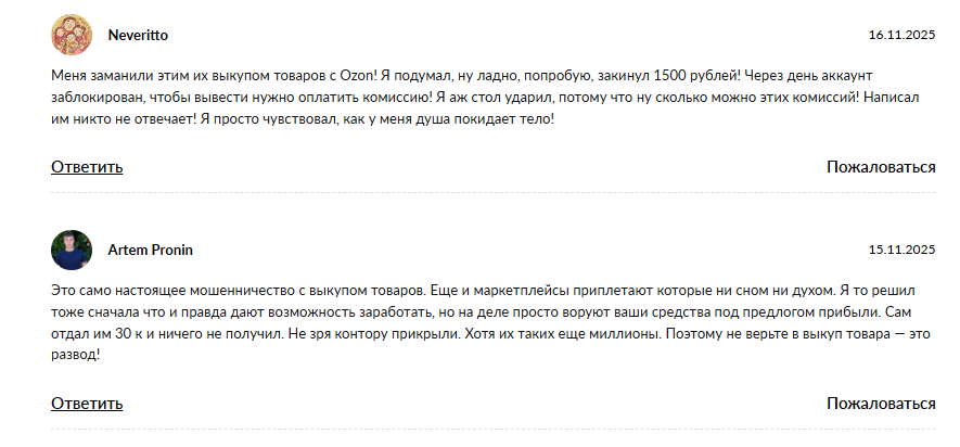 Площадки для обратного выкупа – распространенный метод мошенничества сегодня. Ozoconc – одна из таких платформ. Она действует анонимно и никак не объясняет своей взаимосвязи с маркетплейсом. В сети информации о такой компании не найти. К тому же, всегда можно найти кучу негативных комментариев в интернете. Чтобы не стать жертвой подобных скам-проектов, следите за нашими обзорами, мы рассказываем о реальных способах заработка в сети.