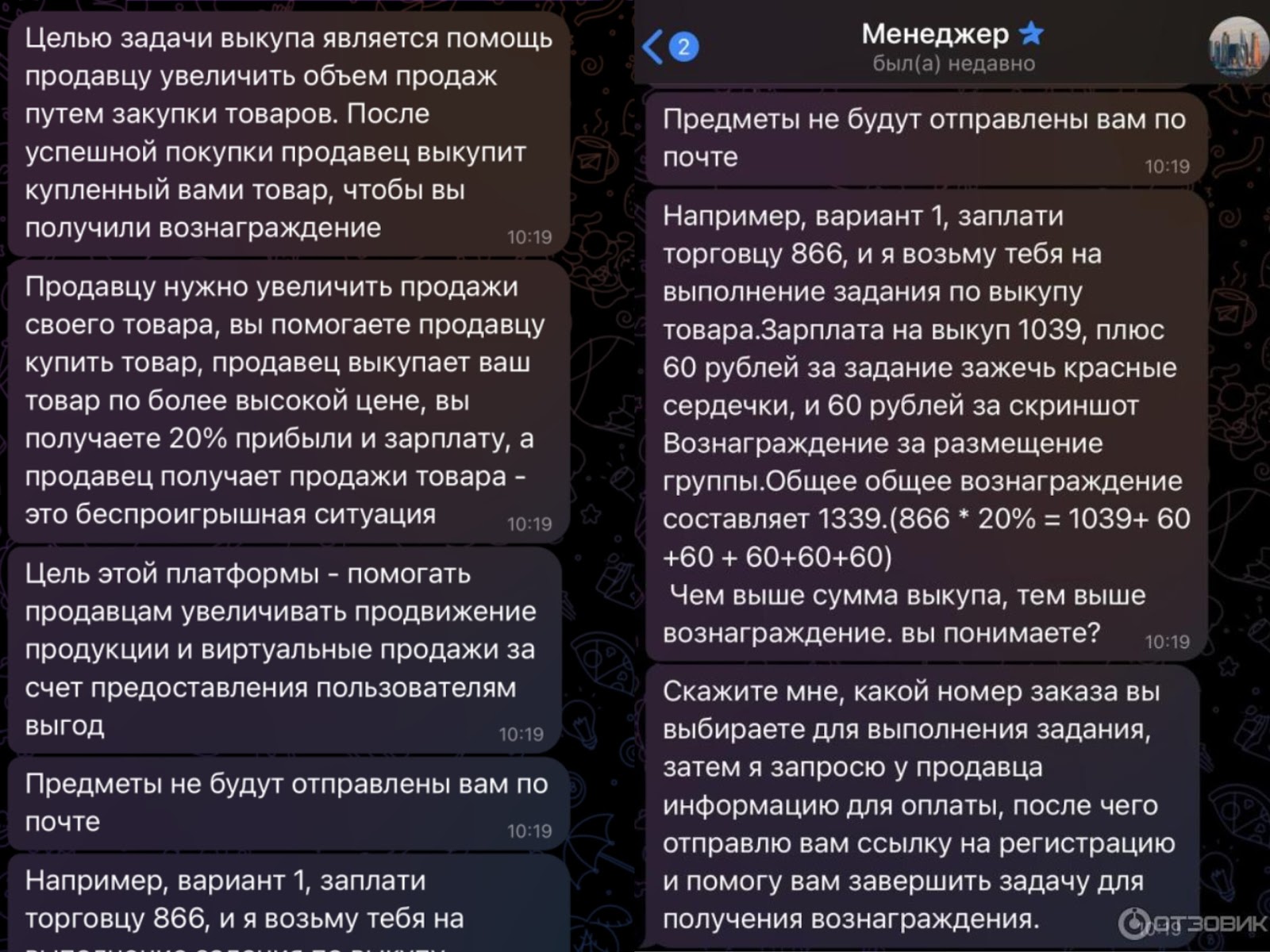 Исходя из отзывов, потенциальным сотрудникам Озонзайп898 поступали сообщения о предложениях работы в мессенджерах Телеграмма или Ватсапа. Менеджер рассказывает о том, что целью выкупа является помощь продавцу в увеличении объема продаж и узнаваемости. Сотруднику нужно совершать определенный депозит на площадке и покупать товар, получая 20% от стоимости. Предметы, которые были приобретены, будут отправляться по почте. Как обозначено, если купить товар на 866 рублей, то зарплата будет 1039 руб. Если добавить “нравится” на товар, то можно рассчитывать на дополнительные 60 руб. По словам менеджера, чем выше цена товара, тем больше можно получить дохода.После соглашения с условиями, юзеру отправляют специальную ссылку для регистрации. Изначально просят покупать недорогой товар, однако для дальнейшей работы просят переходить на новые уровни. Они требуют пополнять счет на большую сумму и покупать дорогие предметы. Если человек отказывается, ему говорят о том, что уже заработанные деньги вернуть не получится. Однако даже при продолжении сотрудничества сделать это невозможно. Какие методы используются для перевода зарплаты, непонятно. Как долго ждать зачисления денег, не обозначено. О комиссиях, которые может взимать сервис, ничего не сказано.