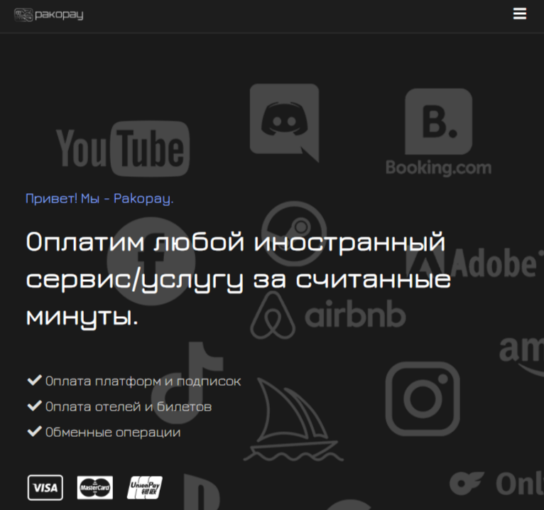 Официальный сайт проекта Pakopay Bot выглядит не особо презентабельно и не информативно, что не характерно для авторитетной и надежной организации, хотя авторы позиционируют ее именно так. Сервис позволяет оплачивать платформы, подписки на сервисы, отели, билеты и совершать обменные операции.