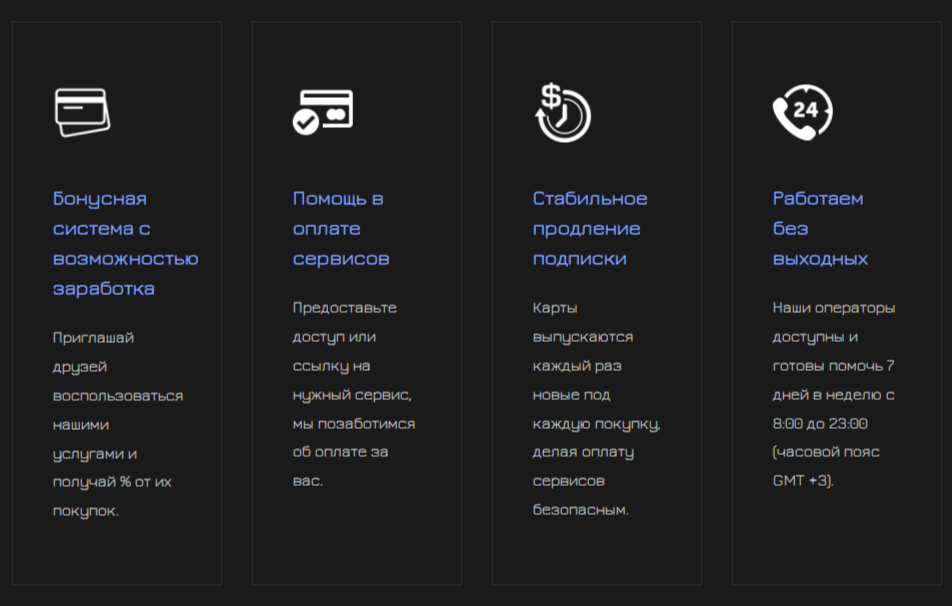 - карты выпускаются каждый раз новые под каждую покупку, делая оплату сервисов безопасным;