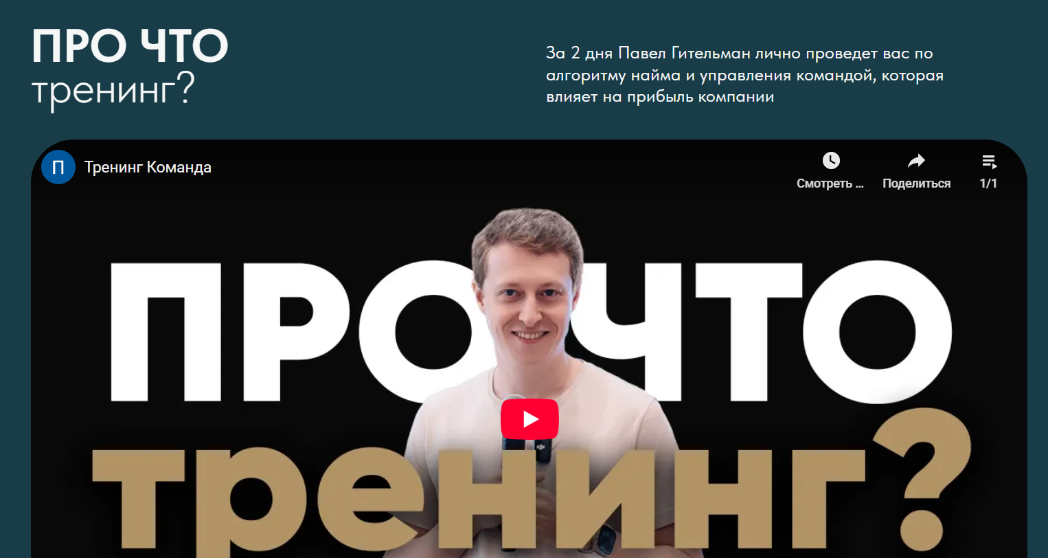 Гительман предлагает авторский тренинг по построению команды. Это интенсив, который помогает предпринимателям освоить подбор сотрудников, мотивацию, структуру управления и внедрение алгоритмов контроля. Якобы дает системный взгляд на найм, разбор ошибок, модели лидерства и инструменты роста команды.