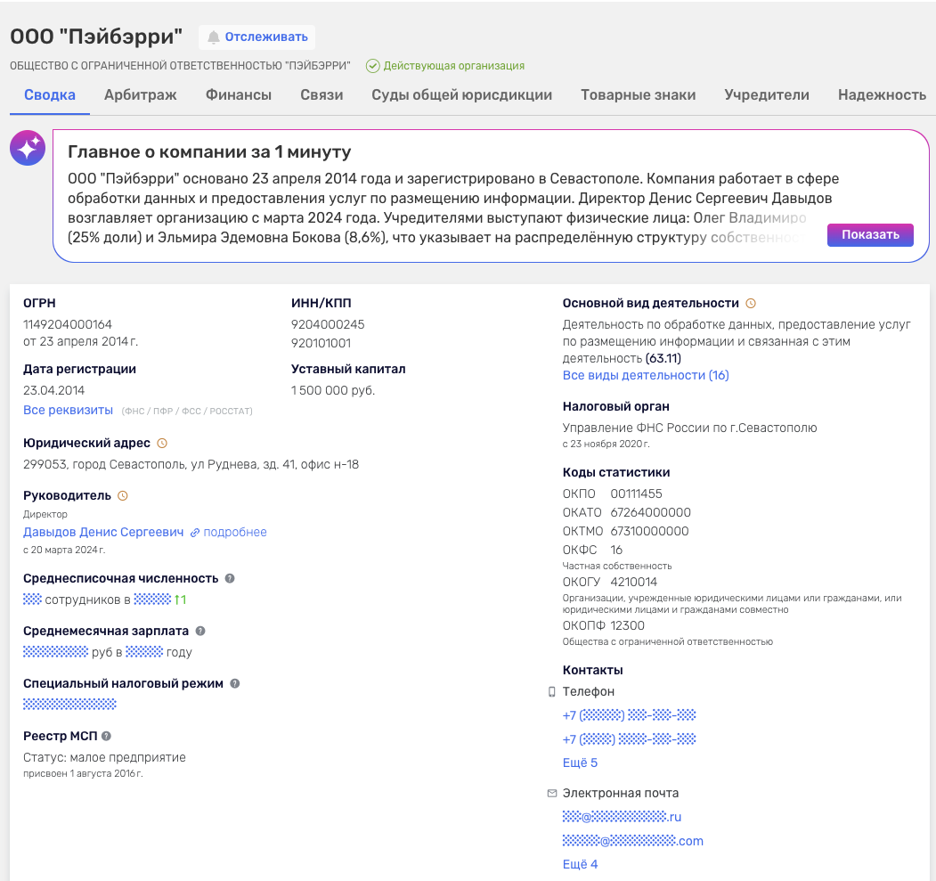 Компания ведет деятельность официально от лица ООО «Пейбэрри». Организация была зарегистрирована весной 2014-го года и имеет уставный капитал в полтора миллиона рублей.