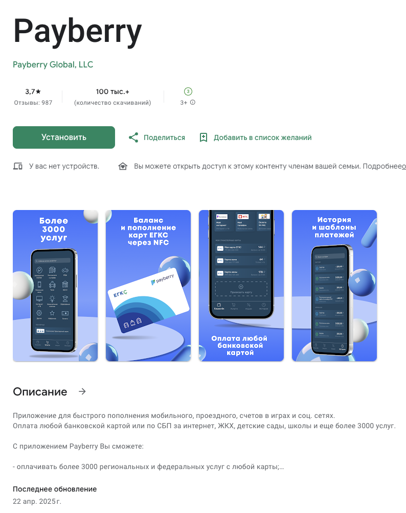 При помощи сервиса «ПайБерри Ру» можно оплачивать: мобильную связь, интернет и телевидение, ЖКУ и т.п. PayBerry ry работает через сайт и мобильные приложения. Согласно статистике магазина Google Play, за все время существования программа была скачана более 100 тысяч раз.