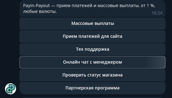 Получение всей основной информации и общение с менеджерами возможно только через бота PayinPayout в Telegram, где даже не отображено число юзеров за последний месяц.