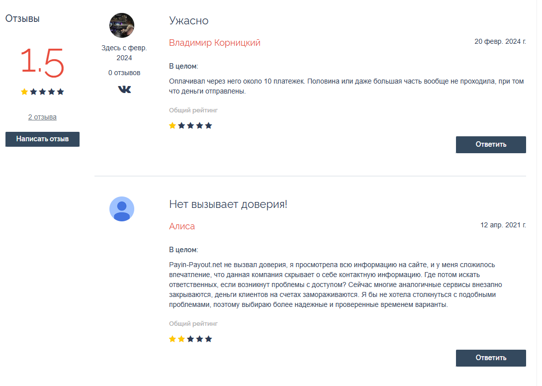 В интернете оказалось очень мало отзывов о Payin Payout, а из имеющихся почти все – негативные. Один из клиентов, например, рассказывает, что часть его платежей даже не дошла. Многие другие пользователи пишут, что ресурс не внушает доверия даже по сайту, и это тоже довольно справедливое замечание.
