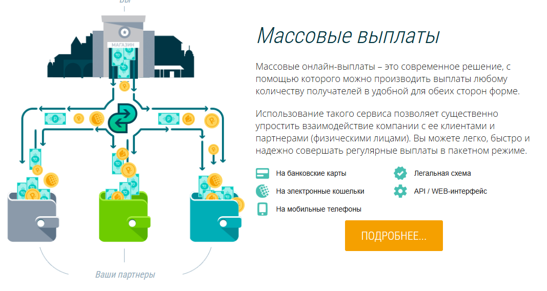 Однако Pay In Payout позволяет владельцам бизнесов не только получать средств, но и отправлять, для этого здесь есть функция массовых выплат: сотрудники, партнеры, клиенты и т.д. могут удобно получать средства на карты, электронные кошельки и телефон. Однако никаких подробностей о тарифах, кроме комиссий от 1%, нет.