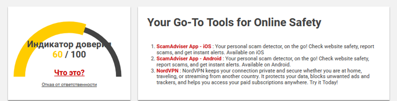 Сторонние мониторинги дают платежной системе оценку ближе к плохой. Индикаторы ScamAdviser показывают 60/100 и находятся в желтой зоне, но максимально близко к красной. То есть уровень доверия низкий.