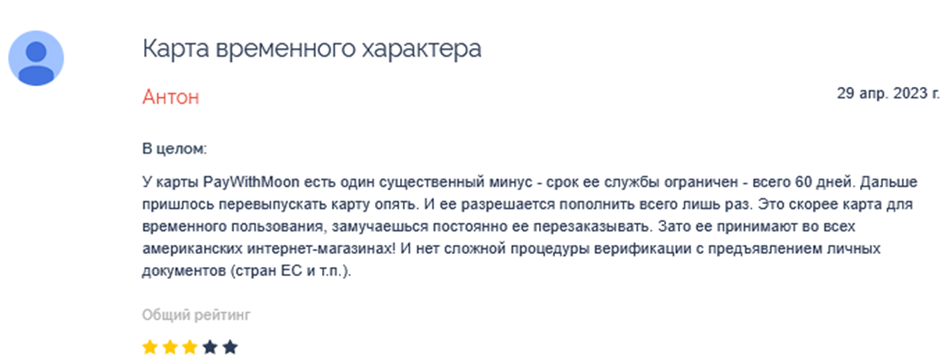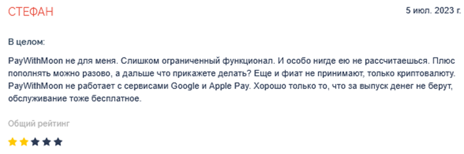 Среди недостатков – невозможность оплаты через Apple и Google Pay. Также карту принимают далеко не все сайты. Исключение – американские интернет-магазины, где можно без проблем рассчитаться через Pay With Moon. К преимуществам относят только бесплатный выпуск и отсутствие сложной верификации.