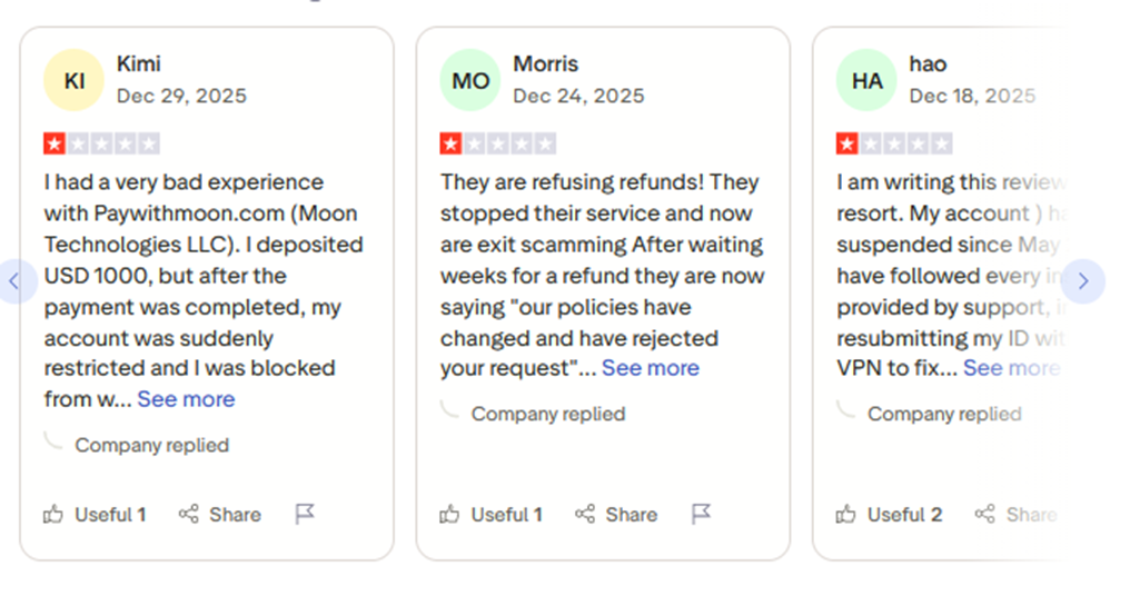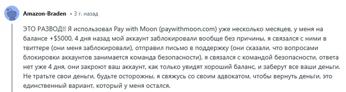 В сети можно найти множество отзывов о работе PayWithMoon. Но большинство комментариев негативные. Многие говорят о скаме и невозможности получить свои средства.