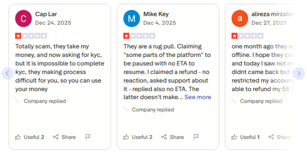 • юридический статус не подтвержден, нет данных о лицензии, регуляторах, гарантиях безопасности;
