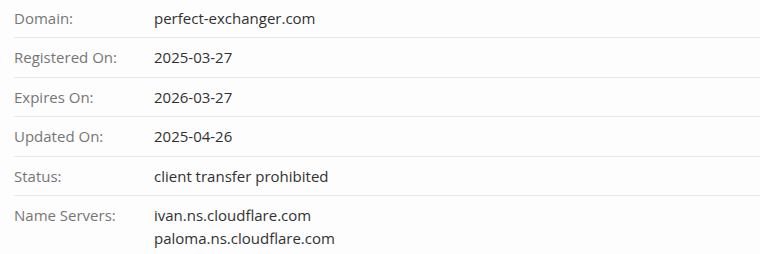 Детали по запуску платформы мы узнали через аналитический инструмент WHOIS. Сервис предлагает конвертацию активов с 27.03.2025 года, лицензии на ведение деятельности нет, как и юридического лица. Если будут блокировки транзакций или заморозки обменов по AML, то привлечь обменник Perfect Exchanger к ответственности не получится.