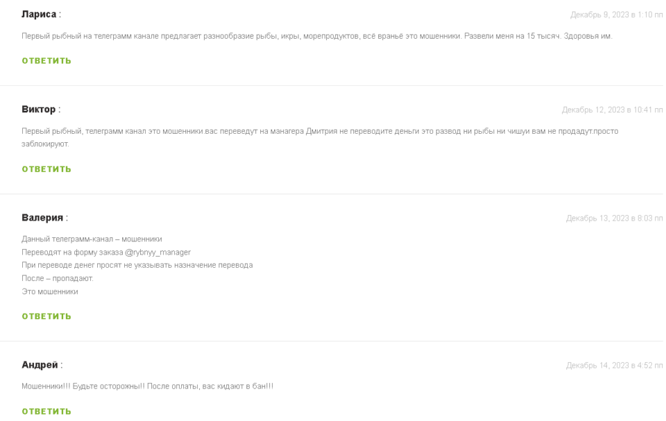 На сторонних площадках о канале «Первый Рыбный» пишут только плохое. Люди жалуются, что после перевода денег товар так и не приходит, а администраторы перестают отвечать в ТГ.