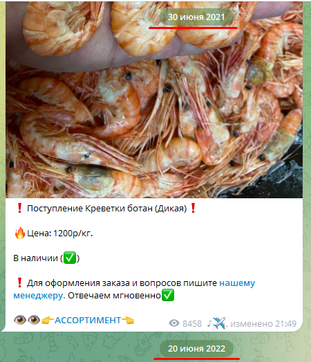 Страница создана в 2020 году. За пять лет канал собрал около 48 тысяч подписчиков, но активных среди них немного — просмотров очень мало, что говорит о накрутке. Чтобы увидеть публикации, нужно одобрение администратора. В публикациях подробно описаны товары и цены, причем якобы ниже рыночных. Мы проверили — в обычных магазинах те же морепродукты стоят почти вдвое дороже. Админы часто устраивают акции и распродажи, стараясь привлечь доверчивых покупателей еще меньшими ценами.