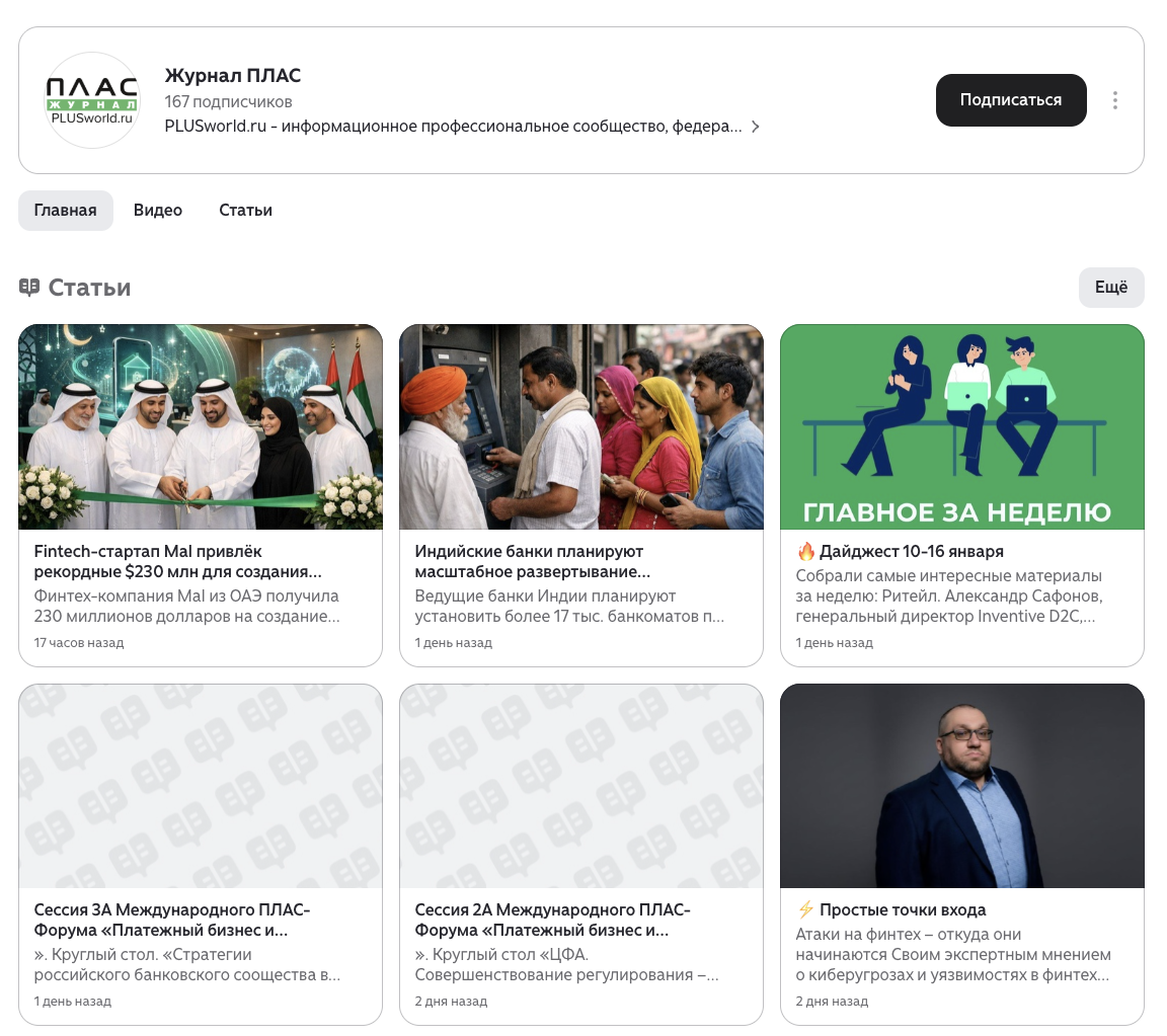 У проекта есть аккаунт и во «ВКонтакте». На эту страницу подписаны всего 280 пользователей. Контент на ней точно такой же, как и в Телеге. Посты в ленте данного аккаунта почти никогда не получают лайков.На странице «Журнал ПЛАС» на «Дзен» тоже небольшая аудитория. На этот аккаунт подписаны всего 167 пользователей.