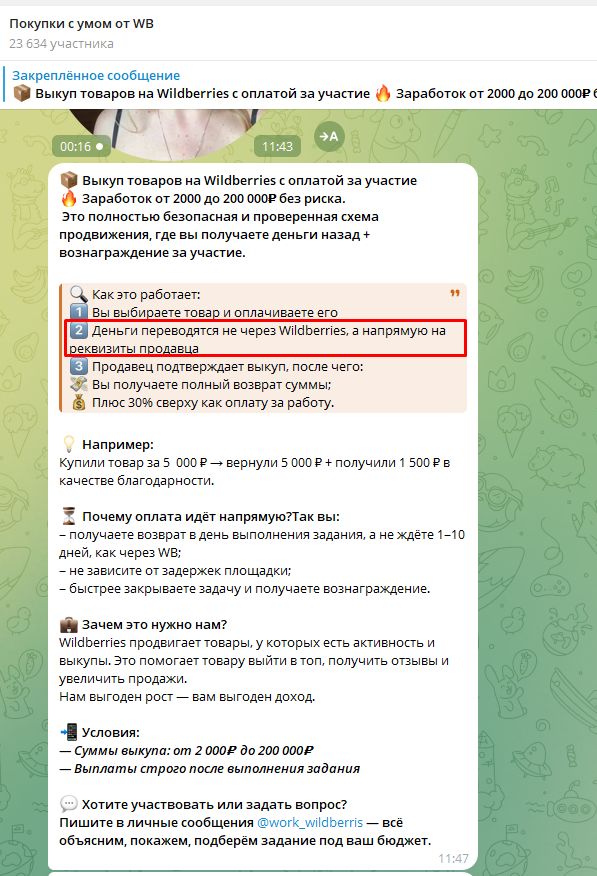 Проведенная проверка показала, что девушка под ником Work Wildberris не имеет никакого отношения к «Вайлдбериз». Фактически перед нами классическая скам-схема, замаскированная под «удаленный заработок» и помощь продавцам. Сотрудничество с этим проектом создает прямые финансовые риски. Вот несколько фактов, указывающих на опасность: