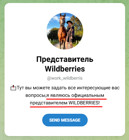 Мошенническая схема устроена следующим образом. Девушка под ником Work Wildberris выдает себя за представителя Wildberries, хотя к самому маркетплейсу она не имеет никакого отношения.