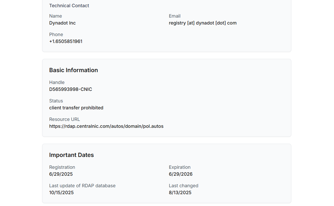 Под данным Whois домен проекта был зарегистрирован летом 2025 года с помощью регистратора Dynadot Inc. Информация о разработчиках и местоположение серверов скрыта настройками приватности.