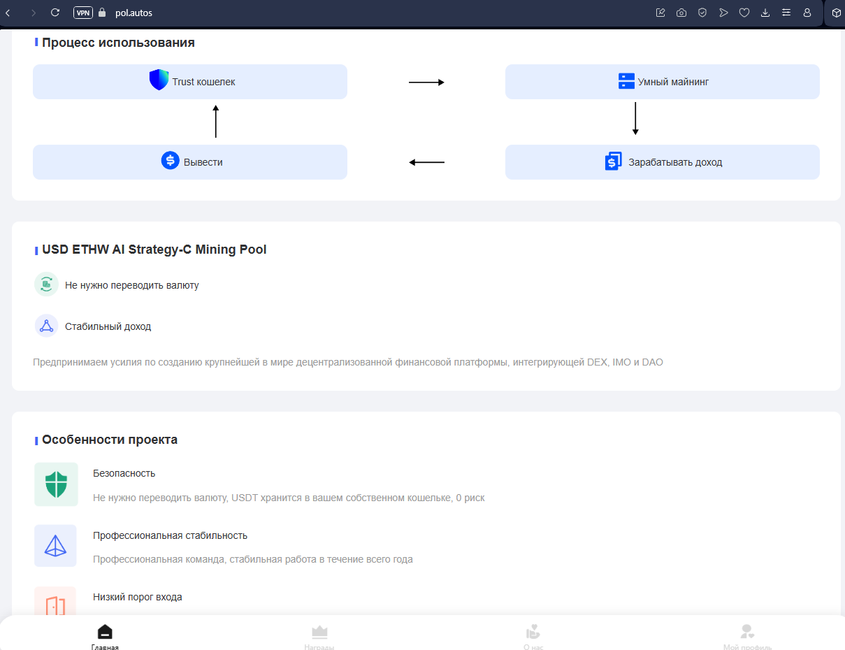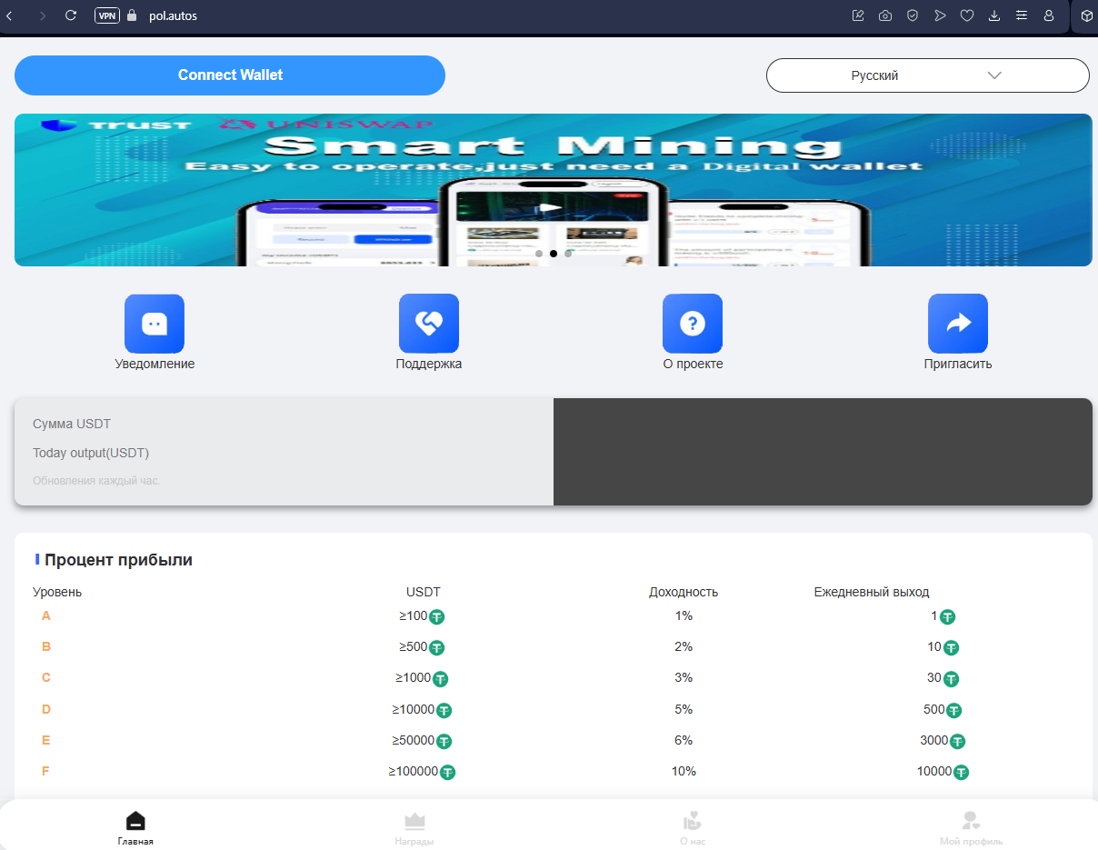 Заметим, что в открытых источниках отсутствуют регистрационные документы, информация о юрисдикции и действующих лицензиях. Площадка напрямую просит подключить кошелек Trust Wallet, после чего предлагает внести депозит от 100 USDT. Правила начислений, лимиты и комиссии не афишируются до момента авторизации.