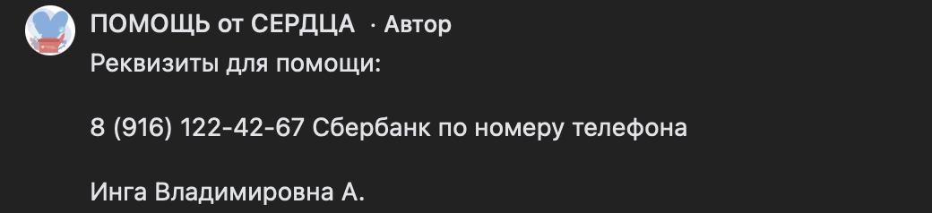 Прежде всего нас сильно насторожила механика проекта и совершения пожертвований. По задумке организатора Инги средства принимаются прямо на карту Сбербанка: автор проекта опубликовала номер телефона, привязанный к «Сберу» в качестве реквизитов.