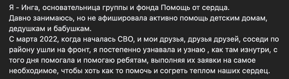 Что именно побудило Ингу организовать гуманитарный проект, остается неясным. В своей группе во «Вконтакте» она сообщает, что первые мысли о создании такой инициативы посетили ее в самом начале СВО. О том, как именно она пришла к организации проекта и как он устроен, Инга не рассказывает.