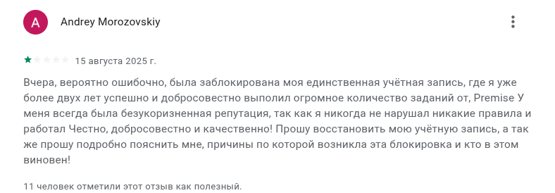 Проект не является однозначно мошенническим, но и надежным его называть не стоит. В отличие от своего конкурента «Яндекс Толока» «Премисе» не имеет официального сайта, а также: