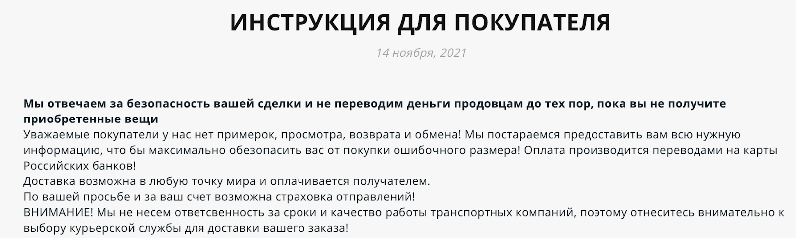Вместо гарантийных обязательств на сайте «Прайв Муд» представлены памятки для продавцов и заказчиков. В них нет ровным счетов ничего полезного: просто обещания возврата и обмена, если клиента товар не устроит. Ответственность за то, в каком виде и срок товар будет доставлен, байер с себя снимает.