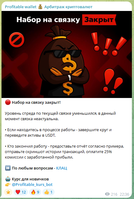 Profitable Wallet Арбитраж криптовалют – это проект, посвященный межбиржевому арбитражу, обещающий пользователям доходность 46% за один цикл сделки. Автор канала утверждает, что предоставляет рабочие связки, алгоритмы и персональную поддержку. Структура канала достаточно типичная: открытие и закрытие наборов, демонстрация «актуальных спредов», предложения вступить в команду и обещания стабильного заработка. При этом отсутствуют прозрачные механизмы контроля, верификация сделок и подтверждение опыта автора.