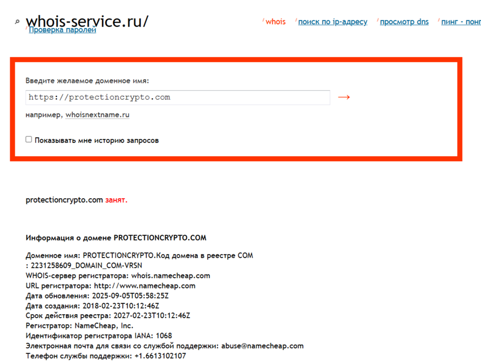 На сайте Protectioncrypto Com указано, что он начал работать в 2025 году. Эта информация подтвердилась. Домен действительно перешел в собственность кошелька в этом году, а ранее он принадлежал другой конторе.