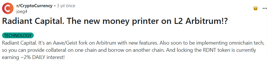 О Radiant высказываются неоднозначно. Один из владельцев Rdnt рассказывает, что зарабатывает на этом coin ежедневно около 2%.