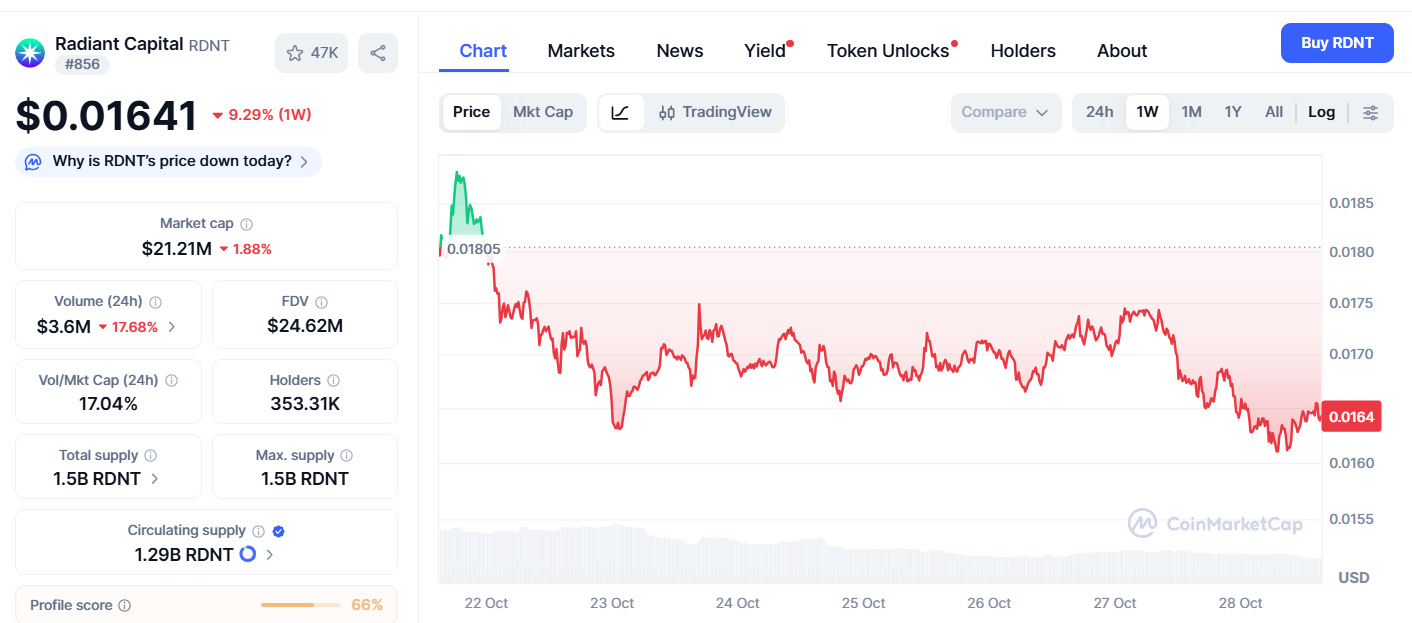 По состоянию на 28 октября 2025 года цена RDNT составляет примерно $0,019. Монета характеризуется высокой волатильностью. Начиная с 22 октября, ее цена стала падать.
