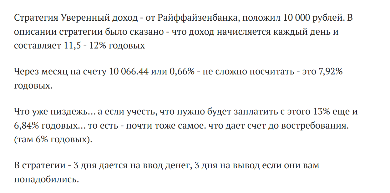 В многочисленных отзывах клиенты рассказывали об успехах применения стратегии Уверенный доход от Райффайзенбанка. Клиенты считают, что такой вариант инвестирования удобен. Он позволяет получать ежедневный доход. Отмечается возможность практически мгновенного вывода заработанных денег.