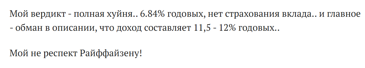 Клиенты отмечают также другие недостатки. В их число входит отсутствие страхования вклада и обман в описании. Представители Райффайзенбанка для привлечения клиентов заведомо дезинформируют своих клиентов. При этом полное описание услуги со всеми нюансами не указывается.