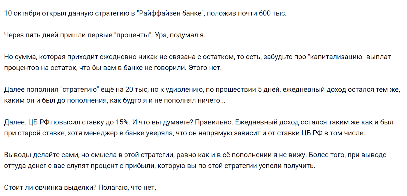 После очередного пополнения счета на 20 000 р клиент обнаружил сохранение выплат на прежнем уровне. Причиной стало то, что Центробанк России изменил ставку до 15%. Получается, что ставка по стратегии Уверенный доход зависит от этого параметра. При этом работники Райффайзенбанка зачастую уверяют клиентов в обратном. На этом фоне многие клиенты банков не рекомендуют использование стратегии из-за крайне низкой доходности.