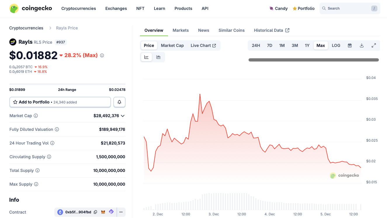 На 5 декабря 2025-го года цена крипты RLS Token составляет 0,019 доллара. Стоимость криптовалюты Rayls, RLS Coin на момент листинга, который произошел первого декабря, составляла около 2,5 центов.