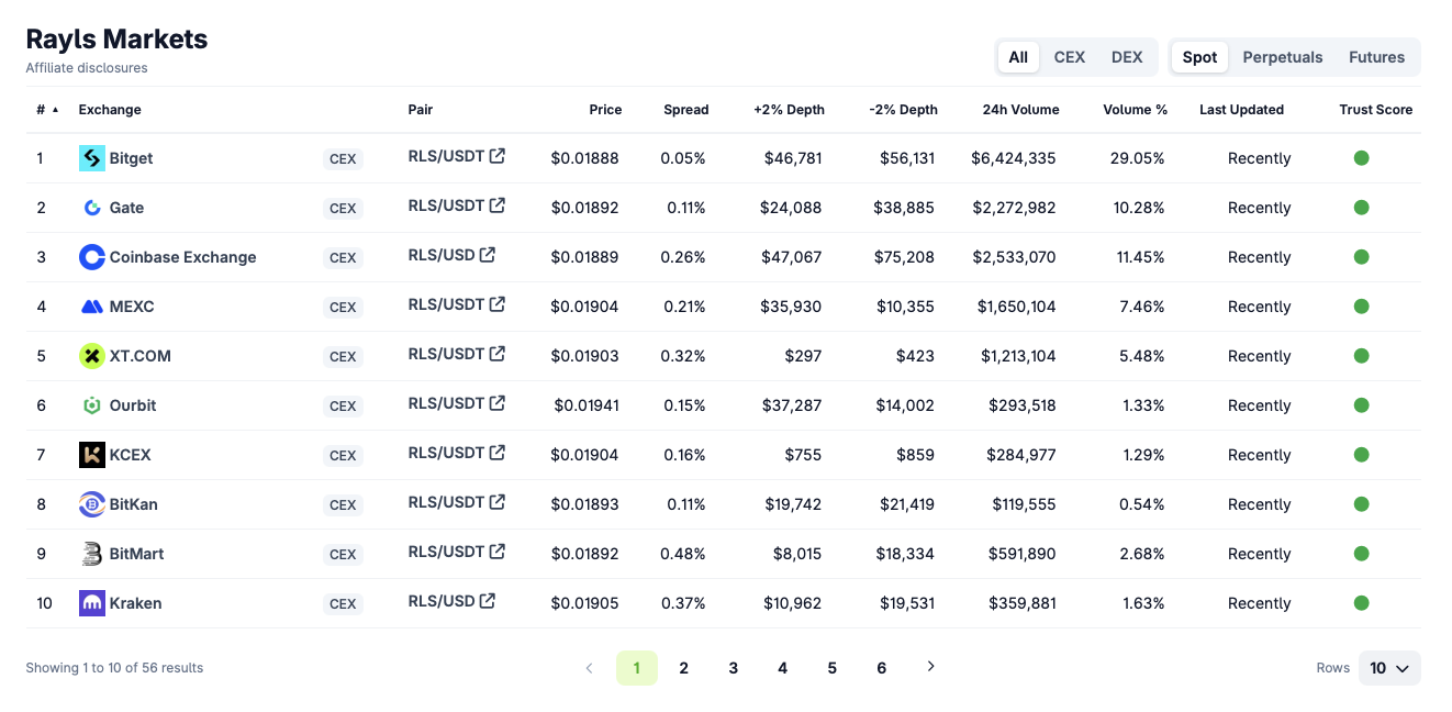 На начало декабря 2025-го года токен RLS возможно приобрести на большом количестве инвестиционных площадок. Криптовалюта представлена, например, на Coinbase, Bitget, Gate, MEXC и многих других биржах.