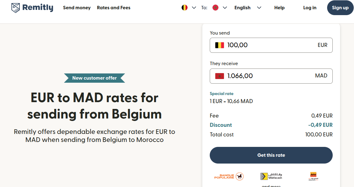 Базовый функционал — посредничество при отправке и получении денег. Для этого у платежной системы Remitly com есть SWIFT коды, IBAN номера, чтобы в рамках законодательства проводить расчеты. Комиссию и лимиты можно узнать прямо во время перевода. Например, за конвертацию EUR в MAD сервис берет 49 евро центов. Однако это для новых пользователей.