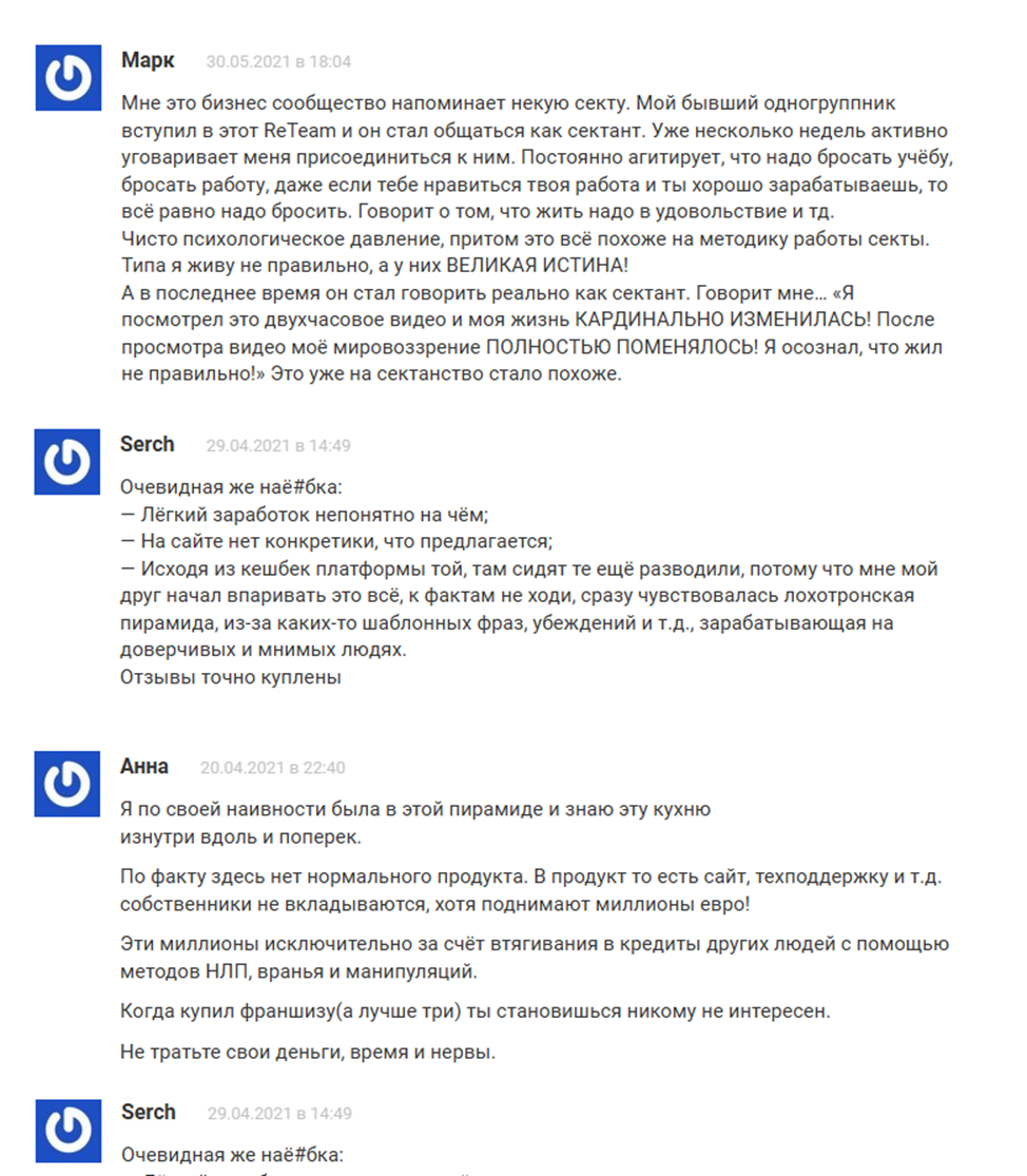 Если в Reteam зазывает родственник или знакомый, то многие заметили странное поведение. Ранее адекватный человек может рассказывать, что ты живешь неправильно, убеждать, что жить надо в свое удовольствие, призывать бросить учебу и работу. Многие отмечают использование техник НЛП. Но все, кто непосредственно столкнулся с проектом, призывают в нем не участвовать, так как в пустую потратите деньги, время и свои нервы.