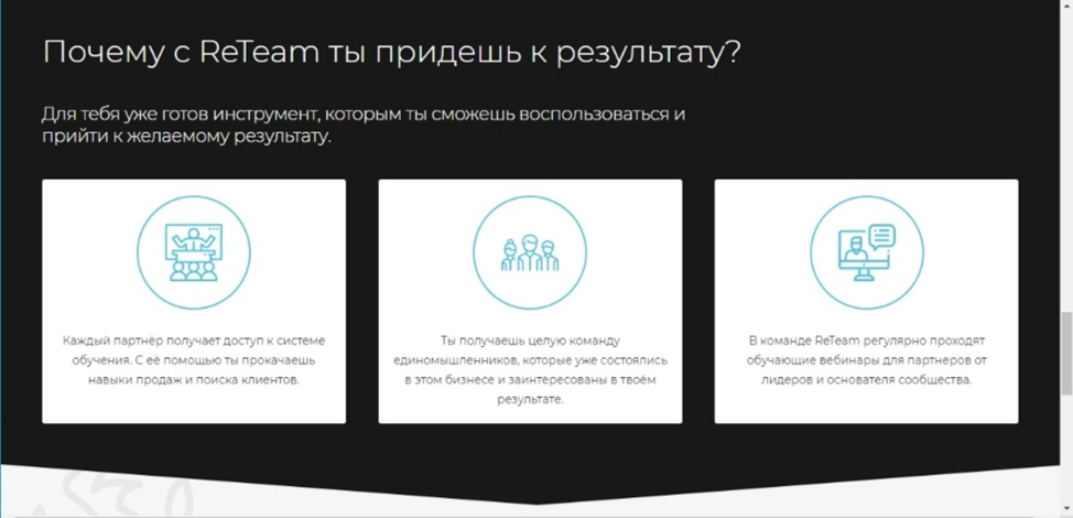 Всем потенциально заинтересовавшимся предлагают посмотреть видео о «Ретим», где обещают полную финансовую свободу. Никакой четкой конкретики нет, образование и опыт работы не важны, есть обучающий курс, где всем должны рассказать принцип заработка. Для большей убедительности на сайте приводят ничем не подкрепленные цифры: 100 новых активных участников за неделю, 170 тысяч человек в команде, 16 тысяч партнеров и множество презентаций.