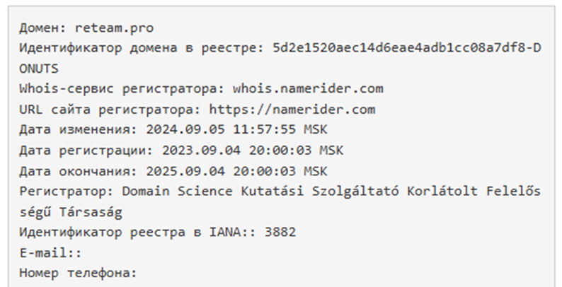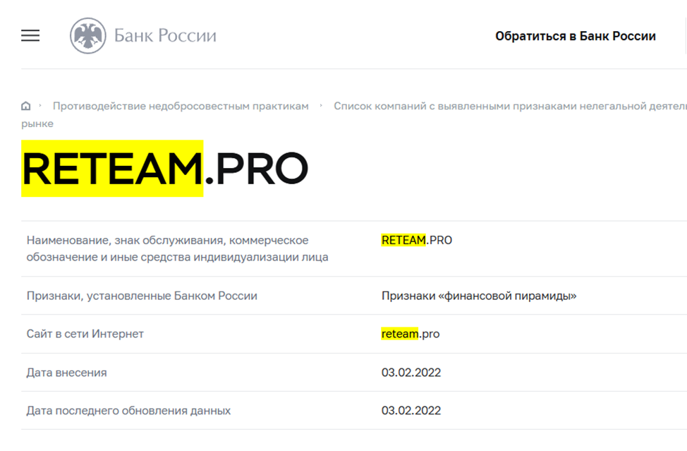 Домен Reteam Pro зарегистрирован 4 сентября 2023 года, но по отзывам начал работать с 2018 года. То есть это дата перерегистрации и сайт стоит сейчас на продаже.Этот факт подтверждается данными Банка России. В работе Reteam были выявлены признаки финансовой пирамиды еще в начале 2022 года. Через некоторое время, получив массу негативных отзывов от пострадавших, мошенникам пришлось сворачивать бизнес по разводу людей на деньги.