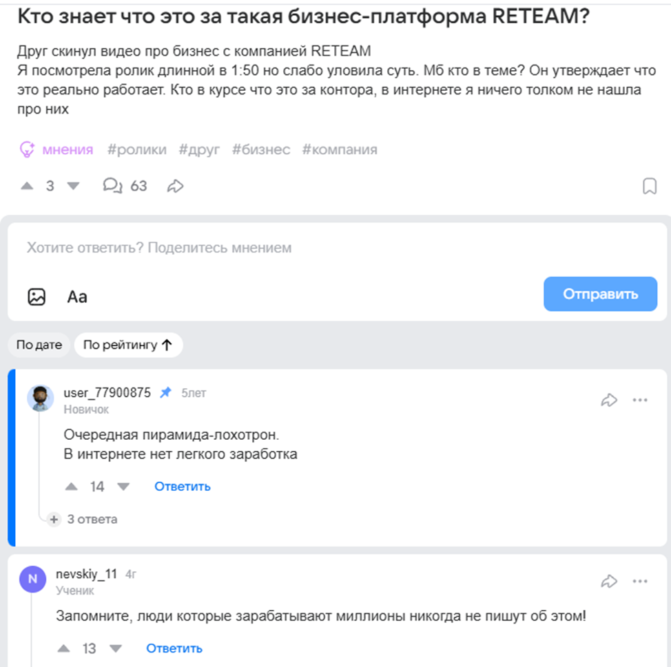 Мы провели обзор проекта Reteam и выяснили, что это очередные аферисты. Разработчики инициативы пытаются убедить, что можно легко зарабатывать миллионы и хорошо жить без особых усилий. В основном попадаются пенсионеры, студенты и женщины в декрете. Так как именно на такие категории граждан с недостаточными знаниями о ведении бизнеса реклама действует максимально эффективно. Находят жертв через сайты знакомств, на форумах или просто пишут в личку, начиная с какого-то «цепляющего» вопроса. Основными признаками мошенничества выступают: