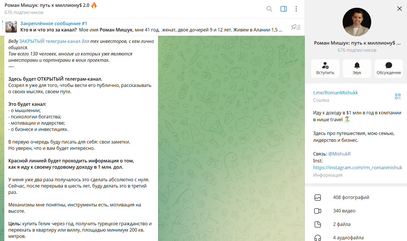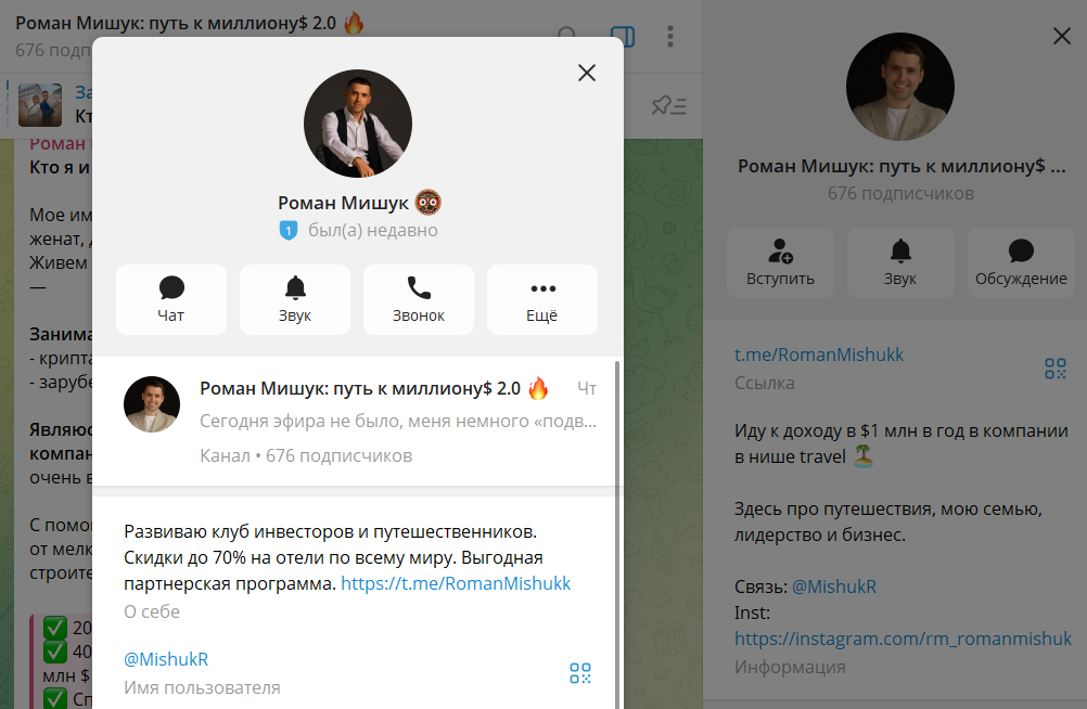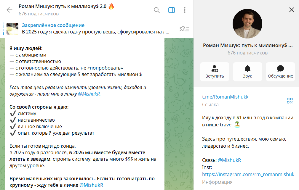 Что известно о телеграмм-канале «Роман Мишук: путь к миллиону 2.0»?