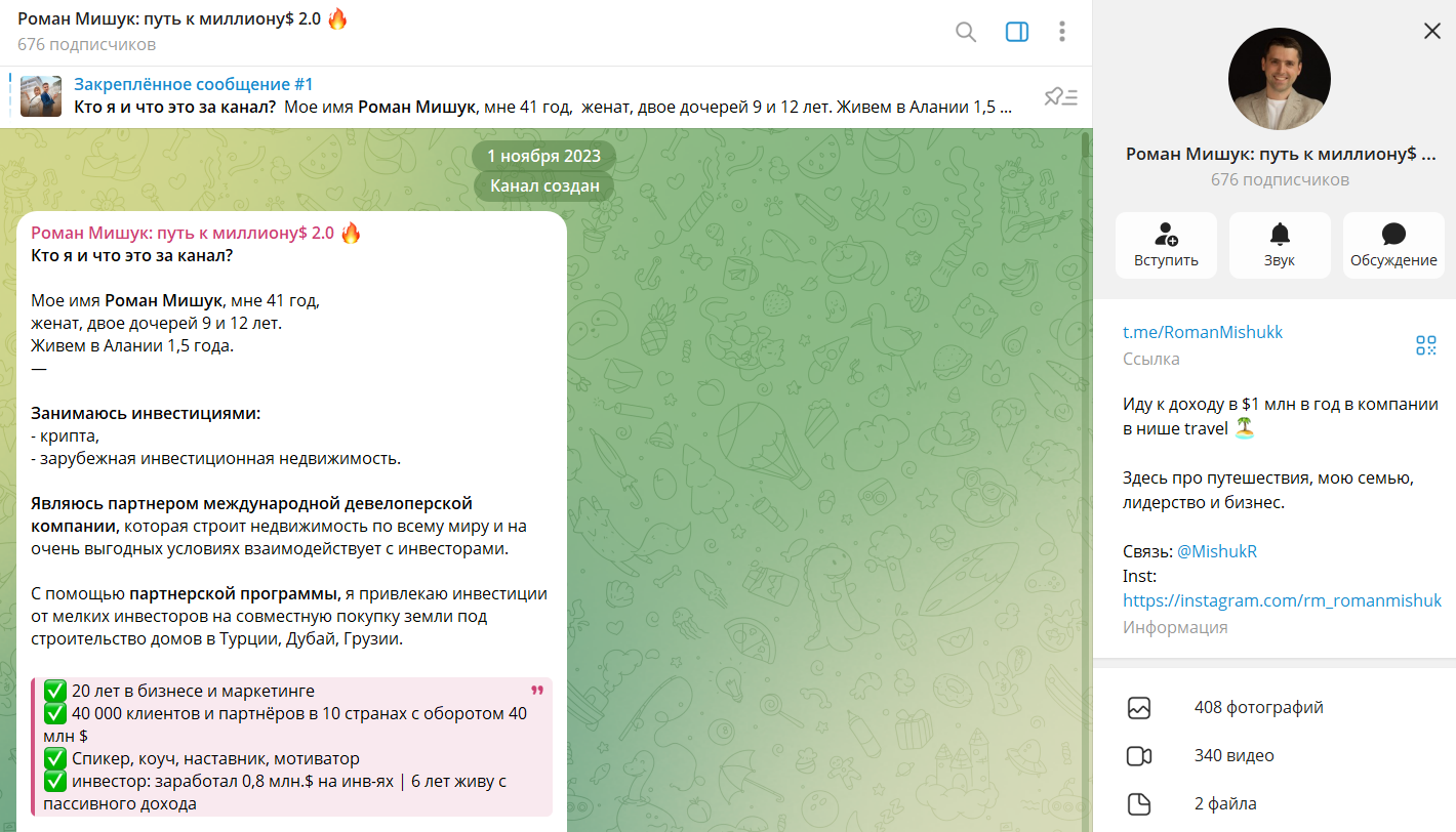 Запущен канал «Роман Мишук: путь к миллиону 2.0» в Телеграмм был 1 ноября 2023 года. В первом посте автор сразу представился публике и рассказал о себе следующую информацию: