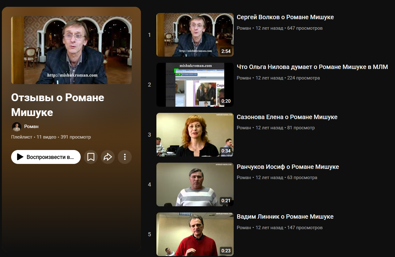 На своих ресурсах, в частности в Ютуб, Роман Мишук публикует отзывы довольных партнеров в формате видео. Все они говорят об успехе в МЛМ и благодарят наставника.