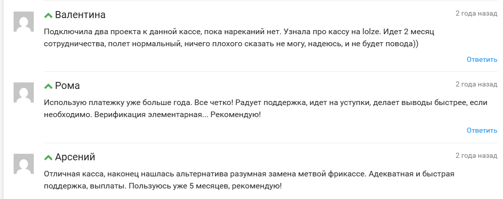 Внимательный мониторинг интернета помог нашей команде найти позитивные комментарии о платежной системе. В положительных о сайте RuKassa отзывах можно увидеть благодарности разработчикам и службе поддержки за качество и быстроту обслуживания.