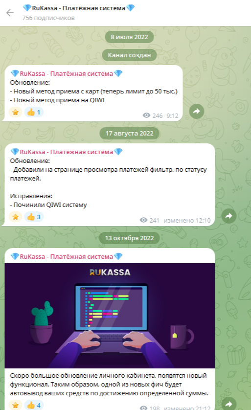 Для продвижения услуг своего сервиса собственники создали проект «RuKassa Платежная система» в Телеграме. Данный канал основан 08 июля 2022 года, имеет всего 756 подписчиков. На ресурсе размещаются посты о сбоях в работе платежной системы, обновлениях, новых локациях. Публикации интересны 200+ пользователям, что говорит о низкой заинтересованности проектом.