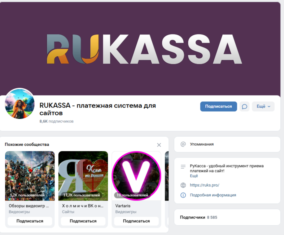 Группу «RuKassa Платежная система для сайтов» можно найти в ВК. Данное сообщество имеет 8 600+ подписчиков. В ленте группы встречаются посты об официальных аккаунтах техподдержки и обновлениях. Последняя публикация датирована августом 2024 года. Сейчас деятельность группы поставлена на паузу.